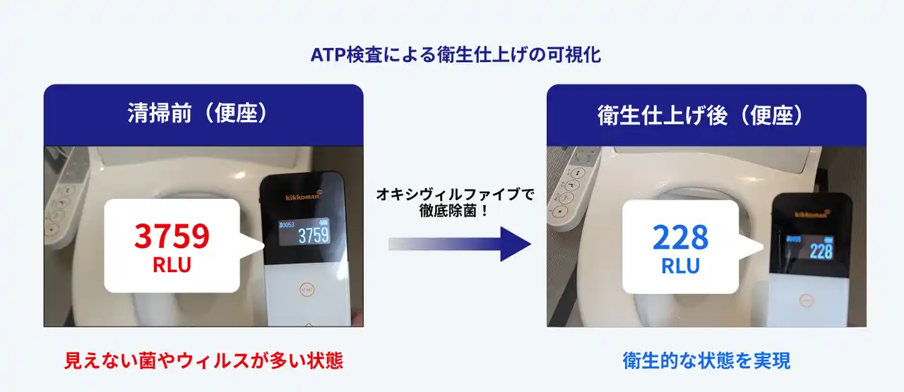 トイレ快援隊では、高品位清掃の効果を感覚だけでなく、ATP検査によって数値でも確認しています。ATPふき取り検査は、便座やドアノブなどの表面を測定し、残存する有機物量を可視化する手法です。 実際に、ドアノブでは清掃前3622から清掃後107、便座では清掃前3759から清掃後228まで改善した事例があり、衛生仕上げの効果を確認しています。 |