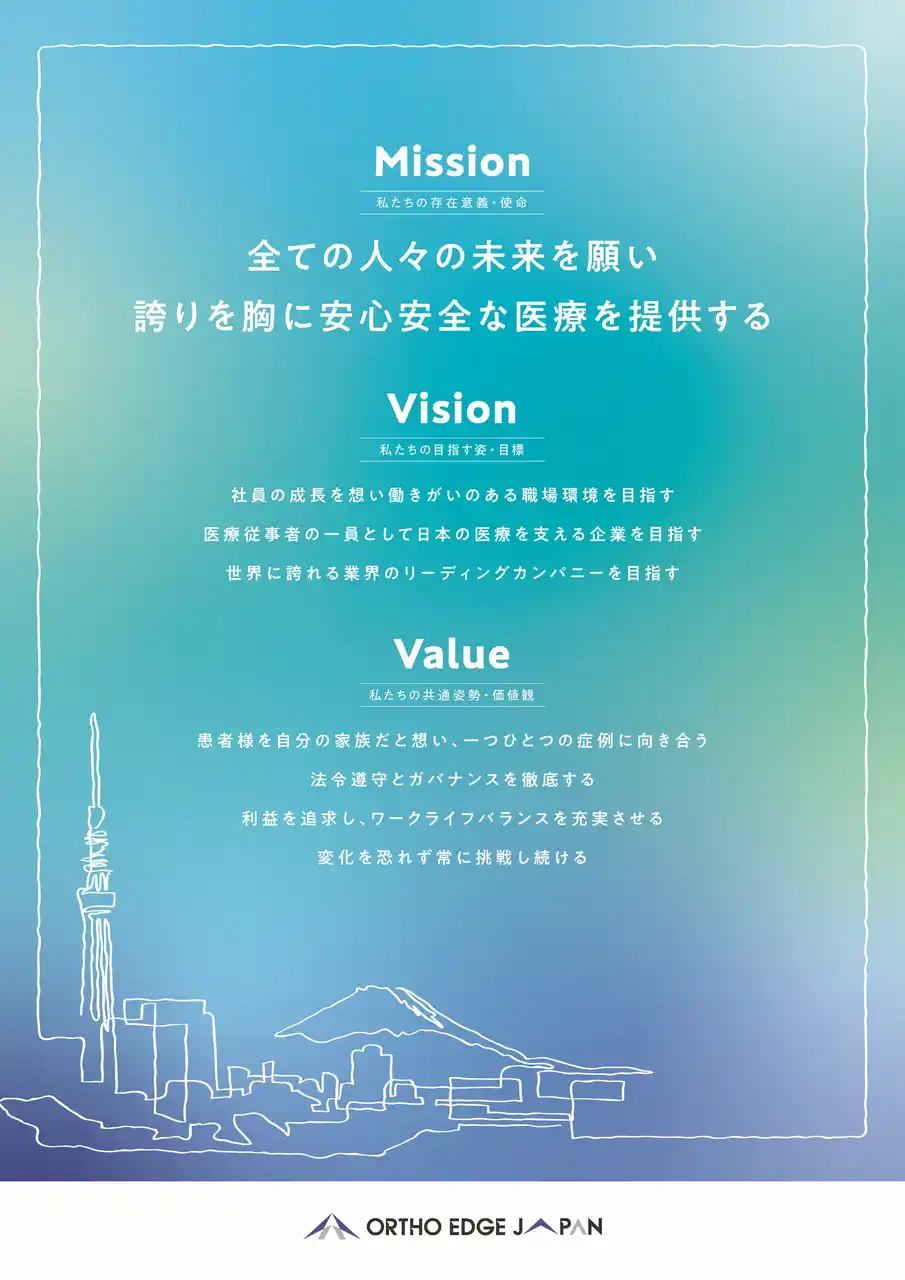 整形外科領域での国内売上トップシェアを誇る医療機器販売会社である、株式会社オーソエッジジャパン(本社:東京都中央区、代表取締役社長:田村 元志、以下、当社 )は、企業としての目指す姿や価値観を明確化することを目的に新たに「ミッション・ビジョン・バリュー(以下、MVV)」を策定しました。 |