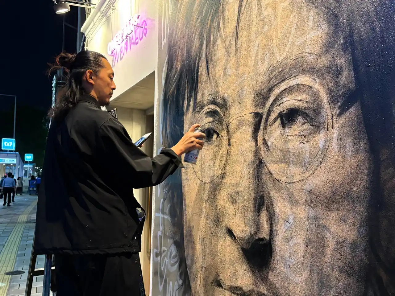 今回OVER ALLsは、トーキョーミューラルスクエア第18弾として、ジョン・レノンをモチーフにした壁画を制作しました。作品の中では彼の頬を伝う涙を、原油を想起させる黒い液体として描き、その輪郭にホルムズ海峡の形を重ねています。中東情勢をめぐる緊張や、物流・エネルギー供給への影響が日々報じられる中、遠い地域の出来事も私たちの暮らしと地続きにあります。本作では、そうした現実を外苑前の日常の風景の中に持ち込みました。 |