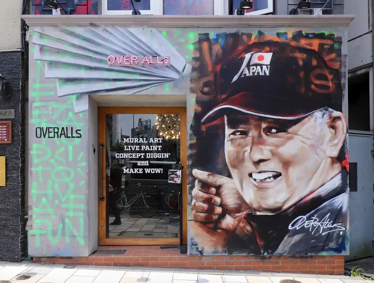 外苑前交差点の真ん中に位置するOVER ALLs本社ビル。そのビルの青山通りに面した壁面にミューラル(壁画)専用の壁を制作。報道として毎月話題の人物やトピックをモチーフとしたミューラル(壁画)を描き重ねていく。NYのTimes Squareのように壁面がメディアとなるイメージからトーキョーミューラルスクエア(TOKYO Mural Square)と名付けた。 |