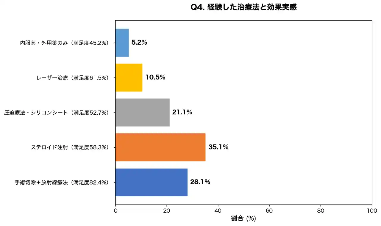 | ステロイド注射が最も多く選択されていますが、満足度では手術切除と放射線療法の併用が突出しています。中等度~重度のケロイドには積極的な治療介入が有効であることを示しています。 | ||||||||||||||||||||||||||||