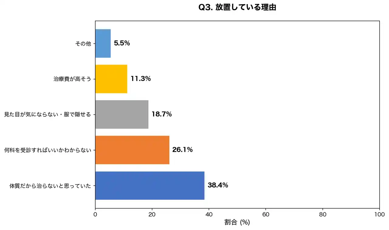 | 【調査結果】放置理由の1位は「体質だから治らないと思っていた」が38.4% | ||||||||||||||||||||||||||||