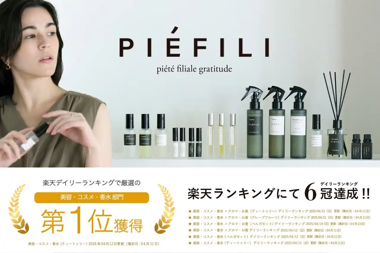 PIEFILI(ピエフィリ)は、「上質な香りを日常で贅沢に使っていただきたい」という想いから誕生した100%天然精油のフレグランスブランドです。 |
