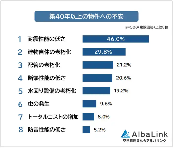 築40年以上の物件における最大の不安は「耐震性能の低さ」となっていました。耐震性能は、地震時に命や財産を守ることに直結する要素だからですね。耐震性能を高める、あるいは耐震性能を証明することで不安を軽減できます。 |