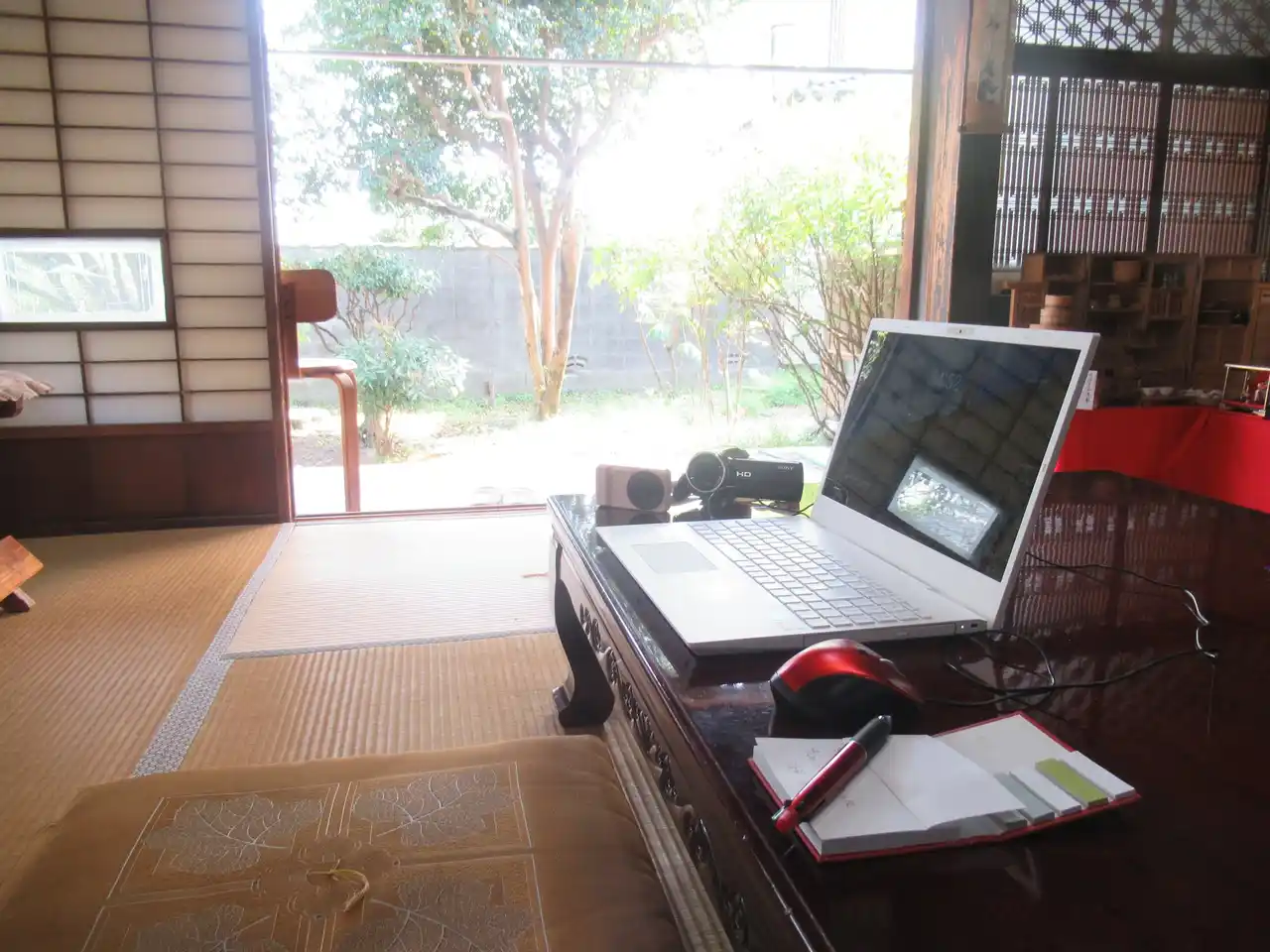 畳表の産地である八代の和室で、庭園を眺め、歴史を感じながら、メタバースを活用した最先端の学びにも取り組む。 |
