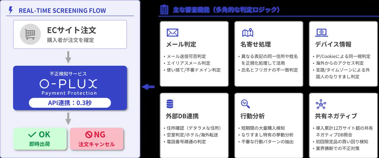 Cacco が提供する不正検知サービス「O-PLUX」は、ECで起こる不正ログイン・不正注文をリアルタイムに検知し、個人情報漏洩やクレジットカードの不正利用、悪質転売などの不正被害の防止及び審査業務の自動化を実現するクラウドサービスです。 |