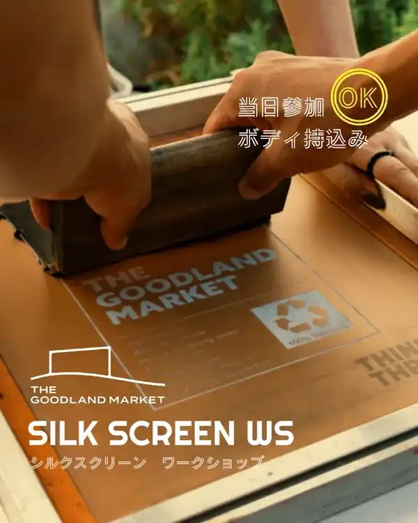 【開催時間】 11:00~18:00 【所要時間】 10~20分 【対象年齢】 どなたでも(小学生以下は保護者同伴でご参加ください) 【予約人数】 定員4名 【価格】 1,100円 【予約方法】 随時受付、混雑時のみ予約制 > WEB SITE Instagram @ ur_commpost THE GOODLAND MARKET オリジナルロゴのシルクスクリーンワークショップ |
