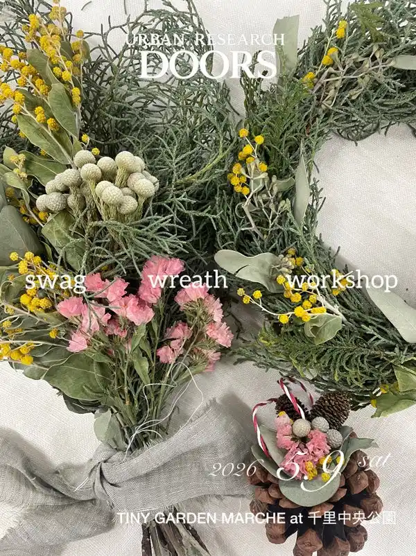市場で見つけたさまざまな種類のお花や、店舗装飾での役目を終えた植物をドライにしてご用意。お好きなチョイスでスワッグやリース作りを体験していただけます。お子様も作りやすいミニスワッグやオーナメントも。 【開催時間】 11:00~ / 14:00~ / 16:00~ 【所要時間】 各回約60分 【対象年齢】 3歳~大人まで(小学生以下は保護者同伴でご参加ください) 【参加人数】 各回6名 【参加費】 スワッグ:ミニ 500円 中 3,000円 大 5,000円 リース:ミニ 500円 中 3,000円 大 5,000 オーナメント:500円 ※『ミニ』『オーナメント』は店舗での役目を終えた再利用花材 、『中』『大』は今回のワークショップのためにご用意した花材となります 【予約方法】 事前申込(空き状況により当日飛び込みも可) > ご予約はこちらから > WEB SITE Instagram @ urban_research_doors TINY GARDEN PHOTO STUDIO 思い出snap! |