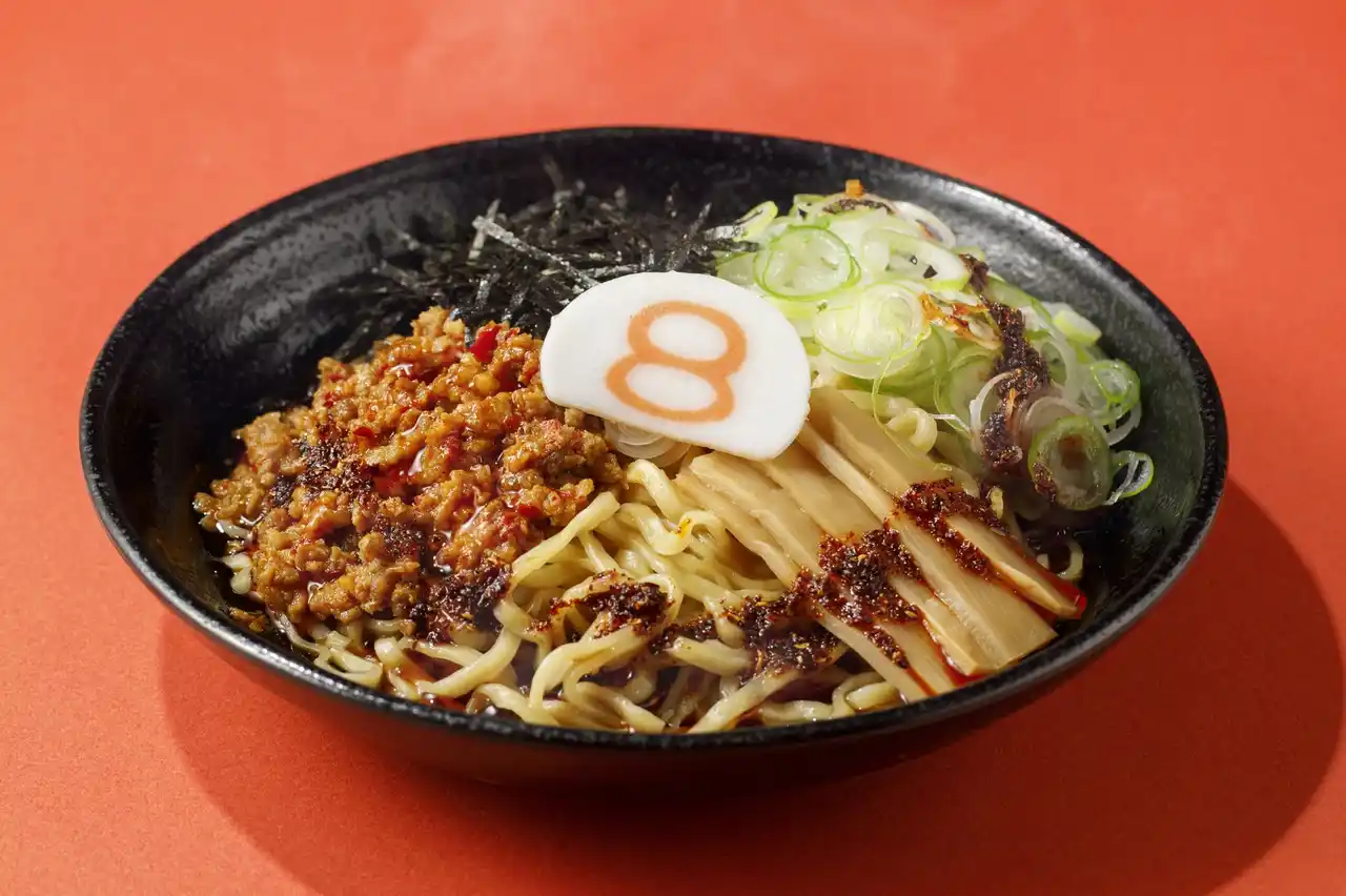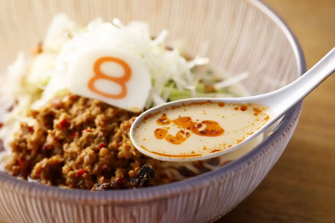 鰹や昆布、チキンの旨みが特長の8番流まぜそば「唐麺」に、肉味噌のコク深い旨味や粗挽き唐辛子の辛味が特徴の「麻辣辛肉味噌」、3種の山椒の痺れと華やかで香ばしい香りが引き立つ「麻辣オイル」をトッピングした、ガツンと刺さるような“シビ辛”がクセになるらーめんです。召し上がる前に具材をよく混ぜてお召し上がりください。 |
