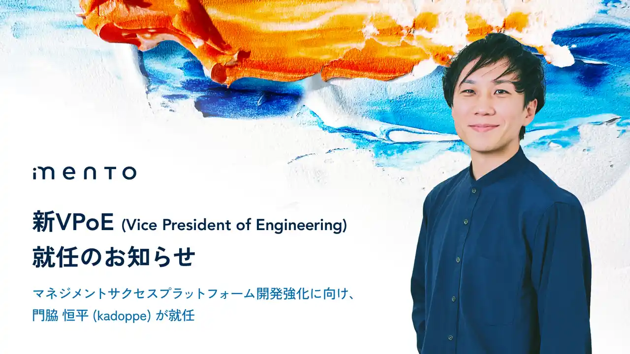 マネジメントサクセスプラットフォーム「mento(メント)」を提供する株式会社mento(本社:東京都港区、代表取締役:木村憲仁、以下mento)は、エンジニア組織のVPoE(Vice President of Engineering)に門脇恒平(kadoppe)が就任したことをお知らせいたします。開発・組織マネジメントを強化し、マネジメントサクセスプラットフォームを実現してまいります。 |