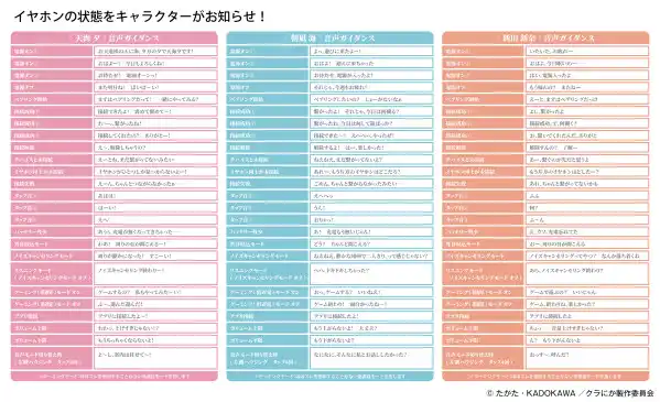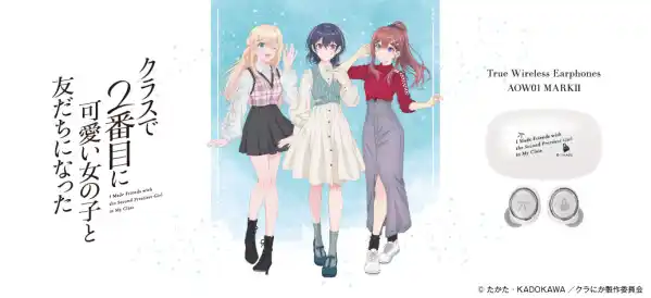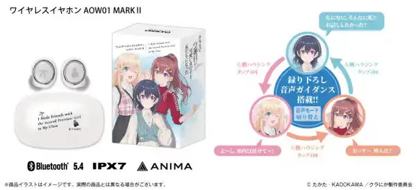本コラボレーションモデルは「朝凪海」「天海夕」「新田新奈」3モード搭載の1モデル。作品タイトルとモチーフを充電ケースと左右ハウジングプレートに配置。音声ガイダンスは「朝凪海」「天海夕」「新田新奈」の新規録り下ろしボイスを搭載し、タップにてキャラクターの切り替えが可能なモードチェンジ仕様となっております。電源オンやオフ、ペアリング時やタップ音、ノイズキャンセリングモード時等、それぞれ計25ワードのボイスを楽しめます。パッケージは描き下ろしイラストデザインとなっております。