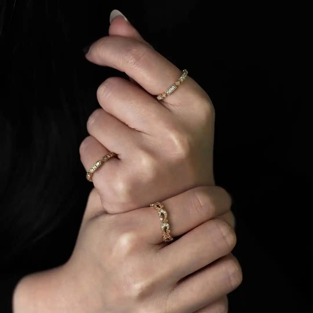 ストレートシルエットのリングには、スクエアやマーキースなど幾何学的な形を反復し、ゴシック建築を思わせる厳かで普遍的な美しさを映しました。唐草模様をモチーフにしたウェーブタイプは、指先にしなやかに沿い、自然の揺らぎを思わせる優美な曲線を描きます。同じシリーズの中に意匠の幅があることも、Mille Gothiqueの魅力のひとつです。 |