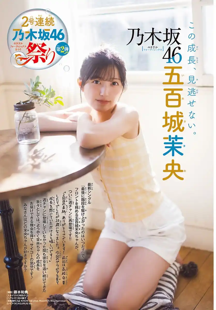 『週刊少年チャンピオン』では前号に続き、「2号連続乃木坂46祭り」を開催! 第2弾となる21+22号では、最新シングル「最後に階段を駆け上がったのはいつだ?」でフロントを務める五百城茉央ちゃんが、ついに週チャンに再登場です!! |