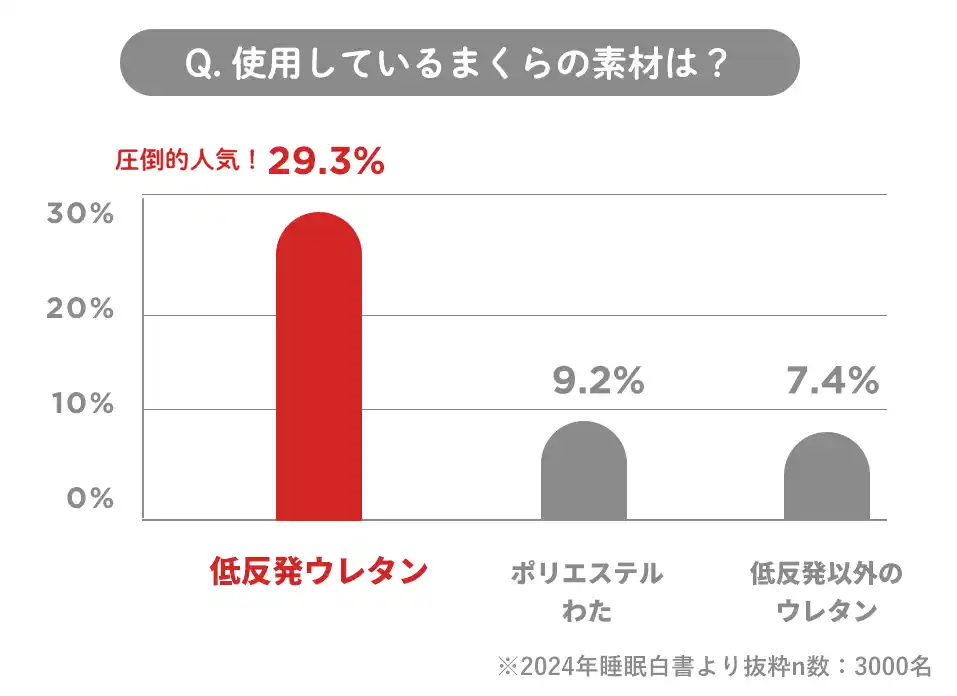 1万人の睡眠実態を追った「nishikawa 睡眠白書」の調査※2によると、使用しているまくらの素材の1位は「低反発ウレタン」で、圧迫感がなく、包み込むようなやわらかい触感のまくらが多くの人に好まれています。一方で、「低反発ウレタン」はやわらかい故に、「沈みこみすぎて寝姿勢が不自然になる」「寝返りを打ちにくい」「冬に硬くなりやすい」などの弱点があります。 |