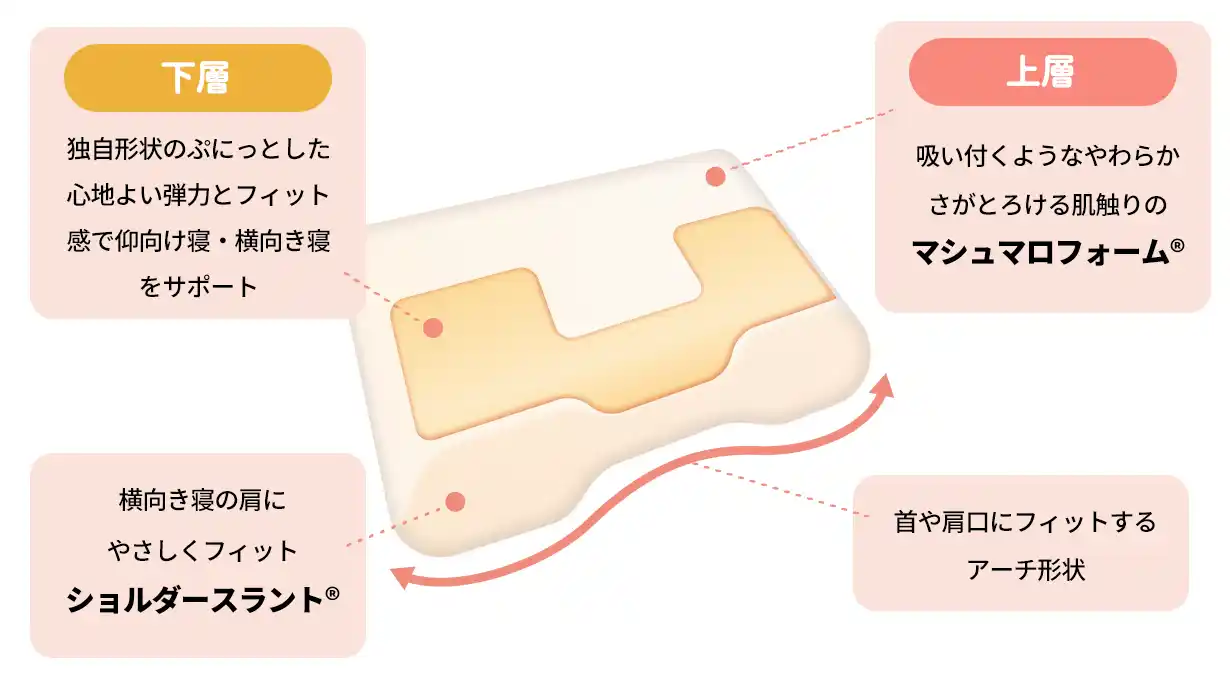 「立体ネックサポート」がサイドに少し高さを作るので、肩を圧迫せずに首の負担も軽減。「マシュマロフォーム(R)」が圧力を分散し、頬にやさしく、首をしっかり支えます。ヨコ60cmのサイズで寝返りも安心です。 |