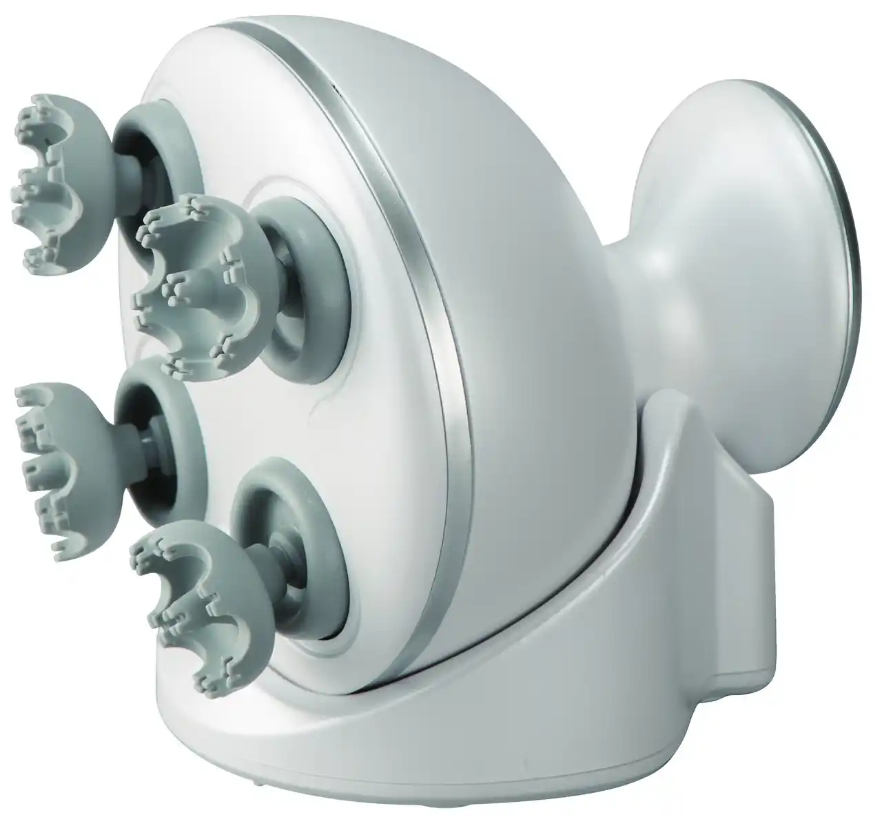 4つのアームが時間差で回転し、アーム先端の円状に並んだ短い突起が力強く頭皮をホールドすることで、心地よい刺激を目指しました。 また、本体は握りやすいくびれ構造で、頭皮へのフィット感をサポートします。 |