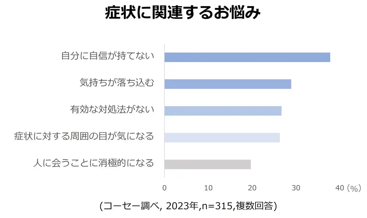 アンケートの回答からは、肌悩みがあることで「自分に自信が持てない」「気持ちが落ち込む」「周囲の目が気になる」といった回答が多く、肌の症状が心理的な負担や社会参画の障壁となっている現状が分かりました。本調査により、しみ・あざは普遍的に存在する肌悩みであり、それは深刻な「社会的・心理的な課題」であることが浮き彫りになりました。さらに、「有効な対処法がない」も回答上位に挙がっていることから、市販されている化粧品を使うだけで簡単に解消できる悩みではないことが伺えました。 |