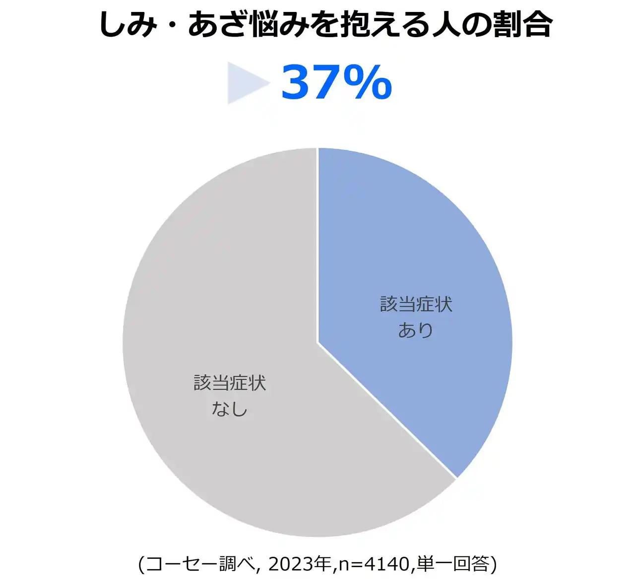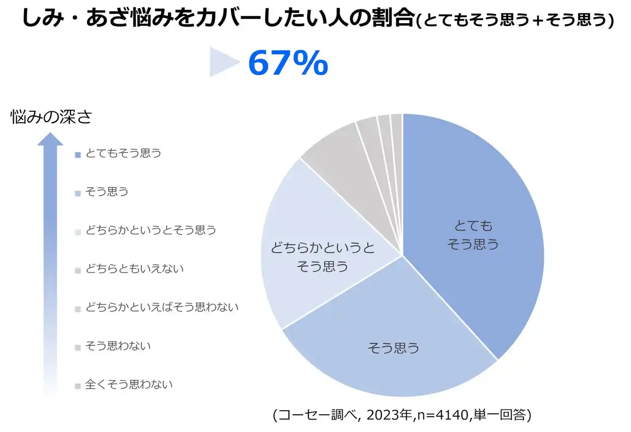 しみやあざは、当事者の生活の質QOLに大きな影響を与える深刻な悩みです。当社はこの悩みの実態を把握すべく、15~69歳の日本人男女を対象に大規模なインターネット調査を実施しました。その結果、しみ・あざに対して何らかの悩みを抱える人の割合は約4割を占め、そのうち約7割の人が「肌悩みをカバーしたい」という強い意向を示していることが確認できました。 |
