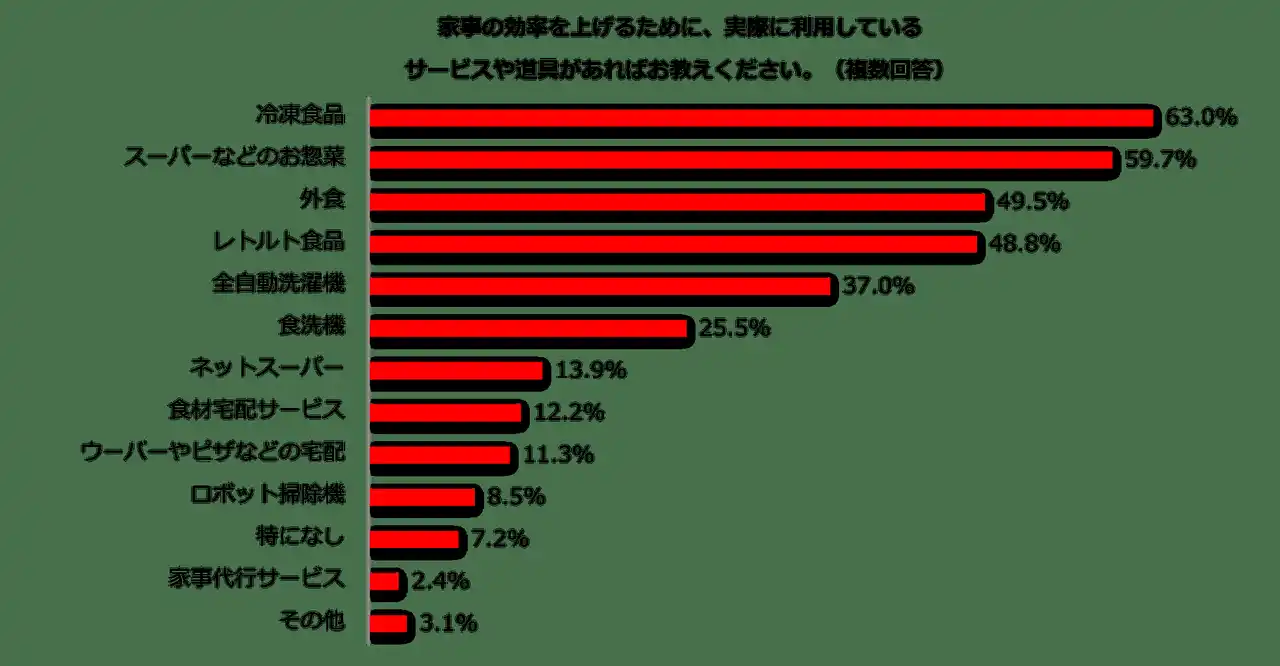 さらに、家事の効率を上げるために実際に利用しているサービスや道具について尋ねると「冷凍食品」「スーパーなどのお惣菜」「外食」がトップ3となりました。家事の中でも日々の料理にかかる工数は大きく、食事関連のサービスや道具が効率化にとって特に強い味方として認識されているようです。フリーコメントには、主婦・主夫層が置かれている現状についての生々しい声が多数寄せられました。多くのご家庭では、家事負担が女性に集中しがちです。誰もが家事を自分事と捉え、家族全員が主体となって家事に取り組む「一億総しゅふ化」が進み、連休中はもちろん日々の生活において家事負担の偏りが軽減されていくことを願います。 |