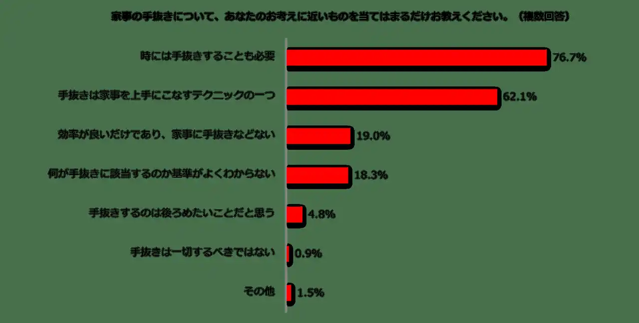 家事の手抜きという言葉に対する印象を尋ねると「良くも悪くもない」が過半数で、「良い印象」と合わせて8割近くは必ずしもネガティブな印象を持ってはいないようです。手抜きに対する考え方についての質問に対しても「時には手抜きすることも必要」が76.7%、「手抜きは家事を上手にこなすテクニックの一つ」62.1%とポジティブに受け止めている様子が伺えます。