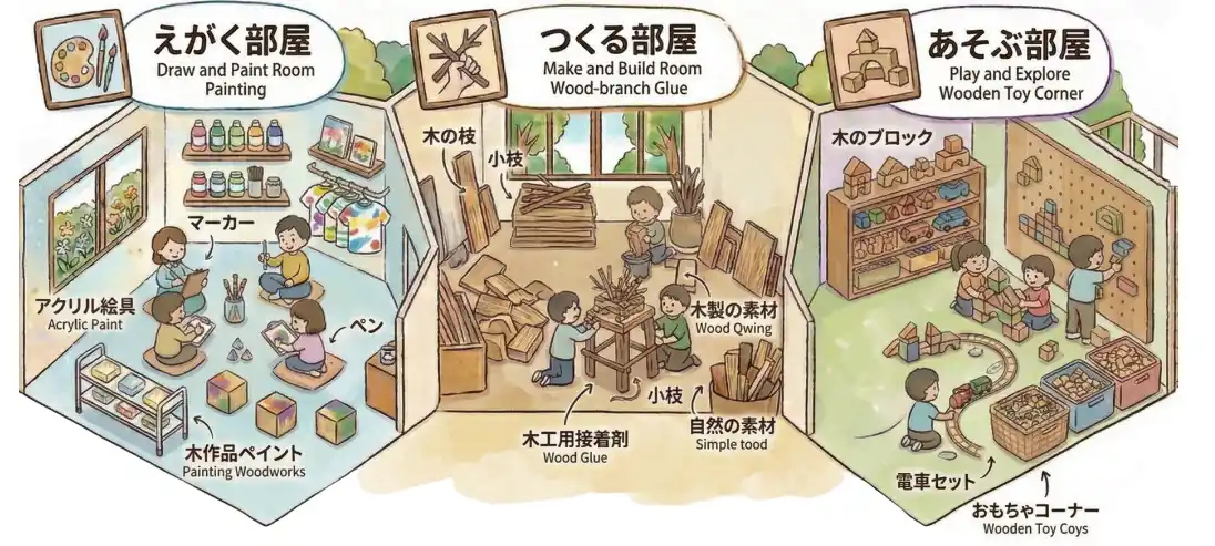 | 【虹のアトリエ(イメージ)】フロントで木材キットなどをご購入いただき、自由にペイントや工作をしていただきます。 | |||