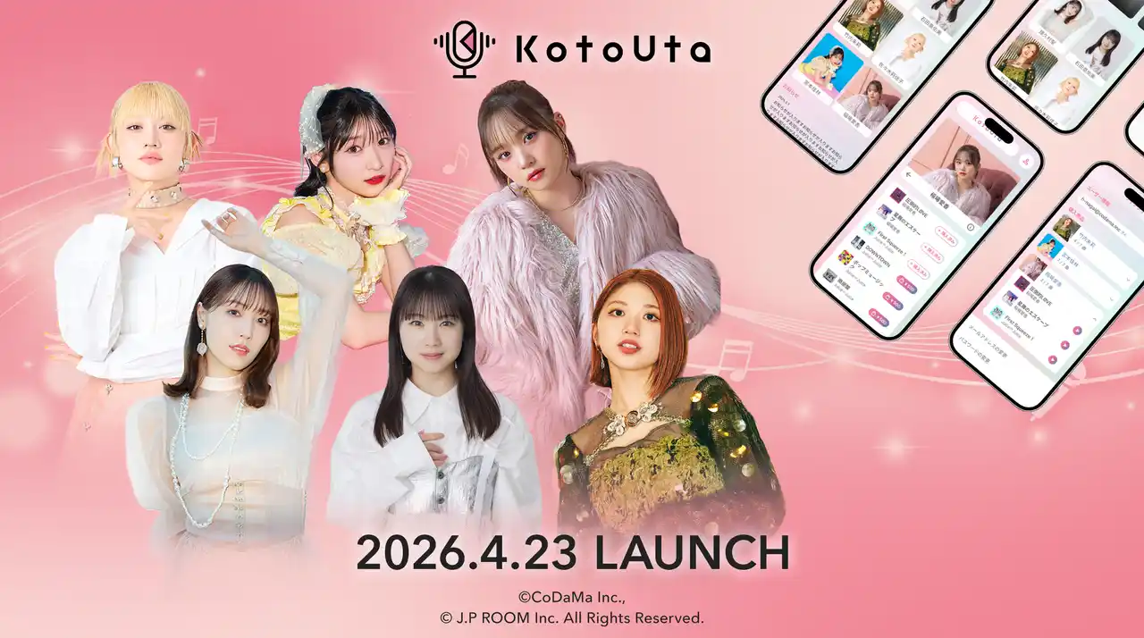株式会社CoDaMa(本社:東京都港区、代表取締役:永井宏樹)とジェイピィールーム株式会社(本社:東京都品川区、代表取締役:常盤杉衛)は、アーティスト自身が楽曲の歌詞を朗読する新感覚ファンサービス「KotoUta(コトウタ)」を2026年4月23日(木)に共同リリースします。 |