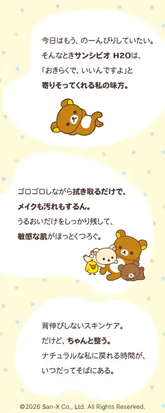 ビオデルマは高いリピート率を背景に、次なるフェーズとして新規顧客層との接点創出を目指していました。この目標に対し、Qoilはこれまでのブランド支援実績を活かし、1本でメイク落とし・洗顔・うるおいケアまで完了する「サンシビオ H2O」の簡便に理想が叶う点と、リラックマが持つ「ごゆるりマイペースでいい」という世界観の親和性に着目。ターゲット層のインサイトに基づいた最適なIP選定から、ブランドの想いを具現化する総合プロモーション企画を立案し、本プロジェクトが実現しました。 |