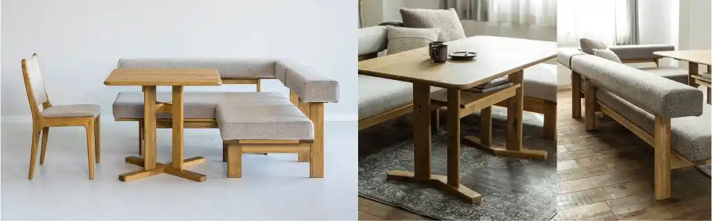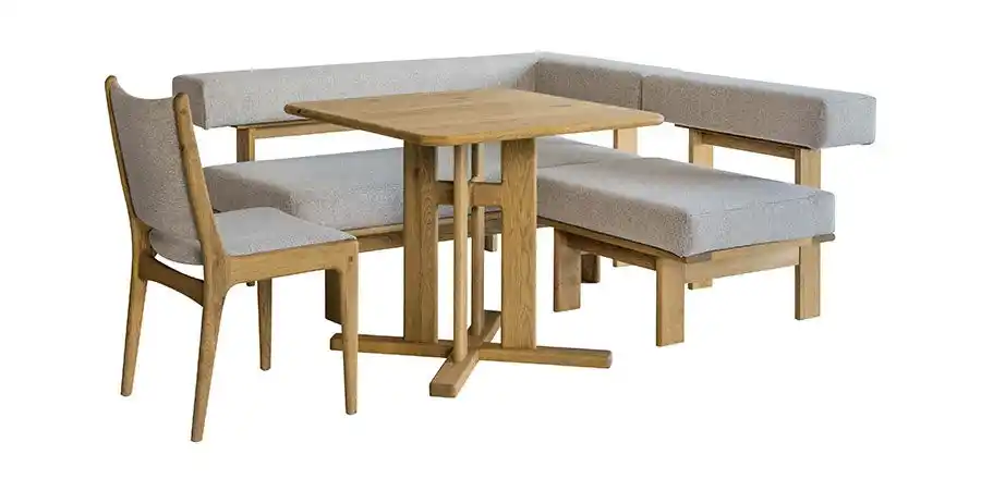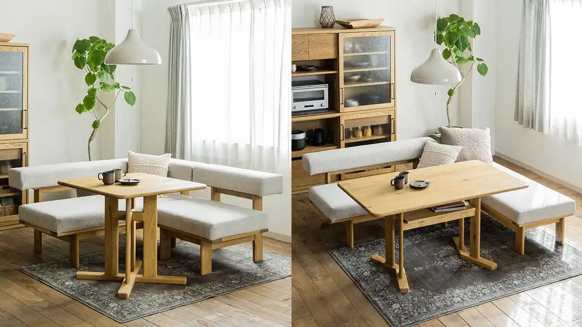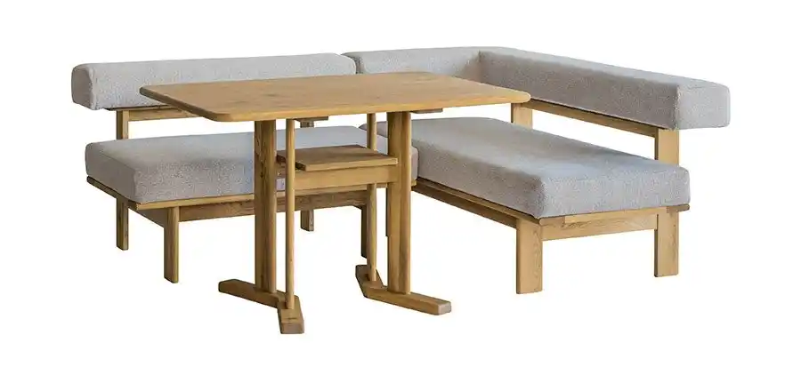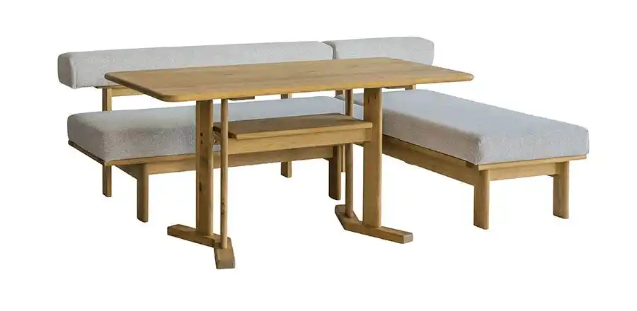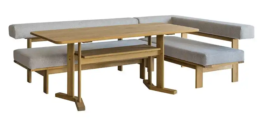 レイアウトの自由度の高さも「ハルヒ」シリーズの魅力です。部屋の広さや家族構成に合わせて、テーブルとベンチの最適なサイズの組み合わせを選べます。コーナーやカウチスタイル、対面など利用シーンに合わせたレイアウトが可能です。 |
