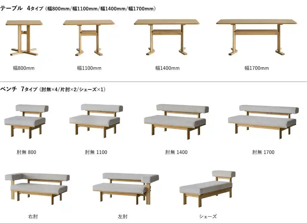 テーブル4サイズ、ベンチ7タイプをラインナップ。肘無ベンチはテーブル天板と同幅の設計のため、同幅で合わせるとすっきりまとまります。また、シェーズ(長椅子)タイプもご用意。足を伸ばしてくつろげます。 |