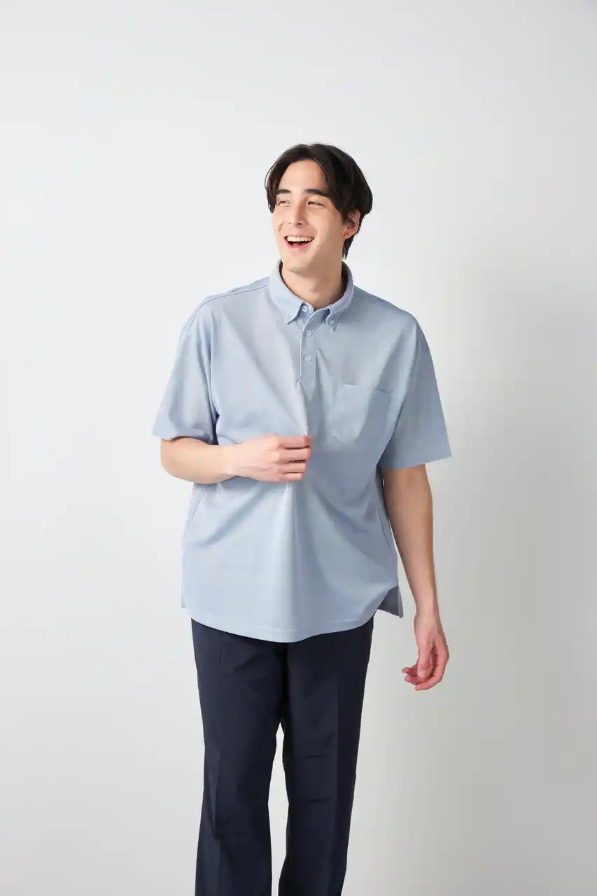 | 心地よい清涼感を提供するため、生地の表面は鹿の子目で独特な凹凸感を施しており、肌に直接触れる面積が少なく、通気性に優れています。また汗を素早く吸い上げ拡散し、その蒸発に伴う気化熱でひんやりとした冷涼感をキープします。さらに、脇下には消臭加工を施したテープを内蔵しており、汗による気になるニオイをしっかり抑制。暑い夏の日でも、朝から晩まで1日中安心してお過ごしいただける清潔感と快適さを追求しました。襟元は襟立ちの良いボタンダウン仕様のため、クールビズから休日のカジュアルスタイルまで、シーンを選ばず自信を持って着用できる一枚です。 | |||||||||