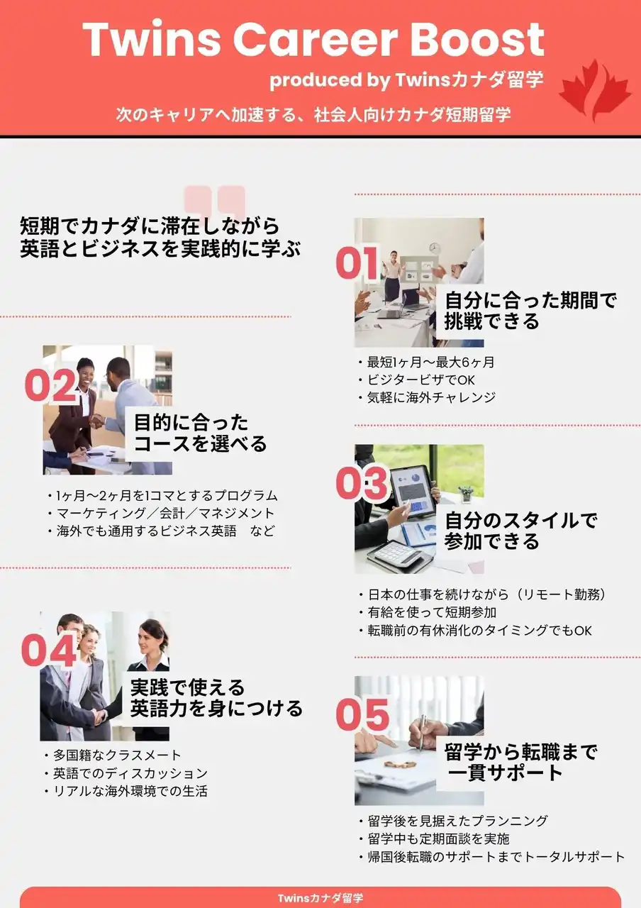 | Twinsカナダ留学(運営会社:TWIN WOODS HUMAN RESOURCE CORP、代表:森 尚樹)は、2026年4月より社会人向け新プログラム「Twins Career Boost(ツインズ キャリアブースト)」を開始しました。 | ||||||||||||||||