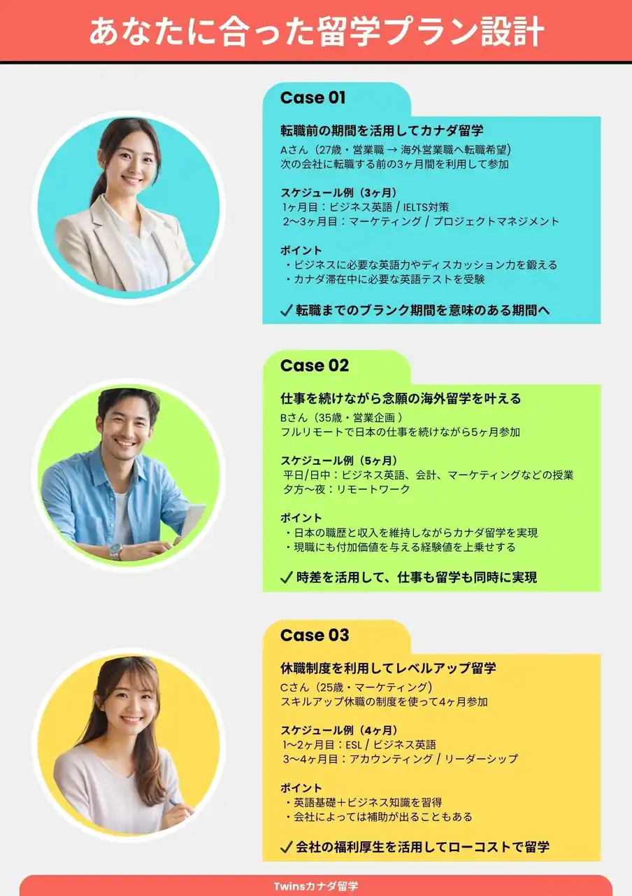 | カナダにおける環境の変化とニーズの高まりを受け、Twinsカナダ留学では、社会人が現実的に挑戦でき、かつキャリアにつながる新しい留学の選択肢として「Twins Career Boost(ツインズ キャリアブースト)」をスタートしました。 | ||||||||||||||||