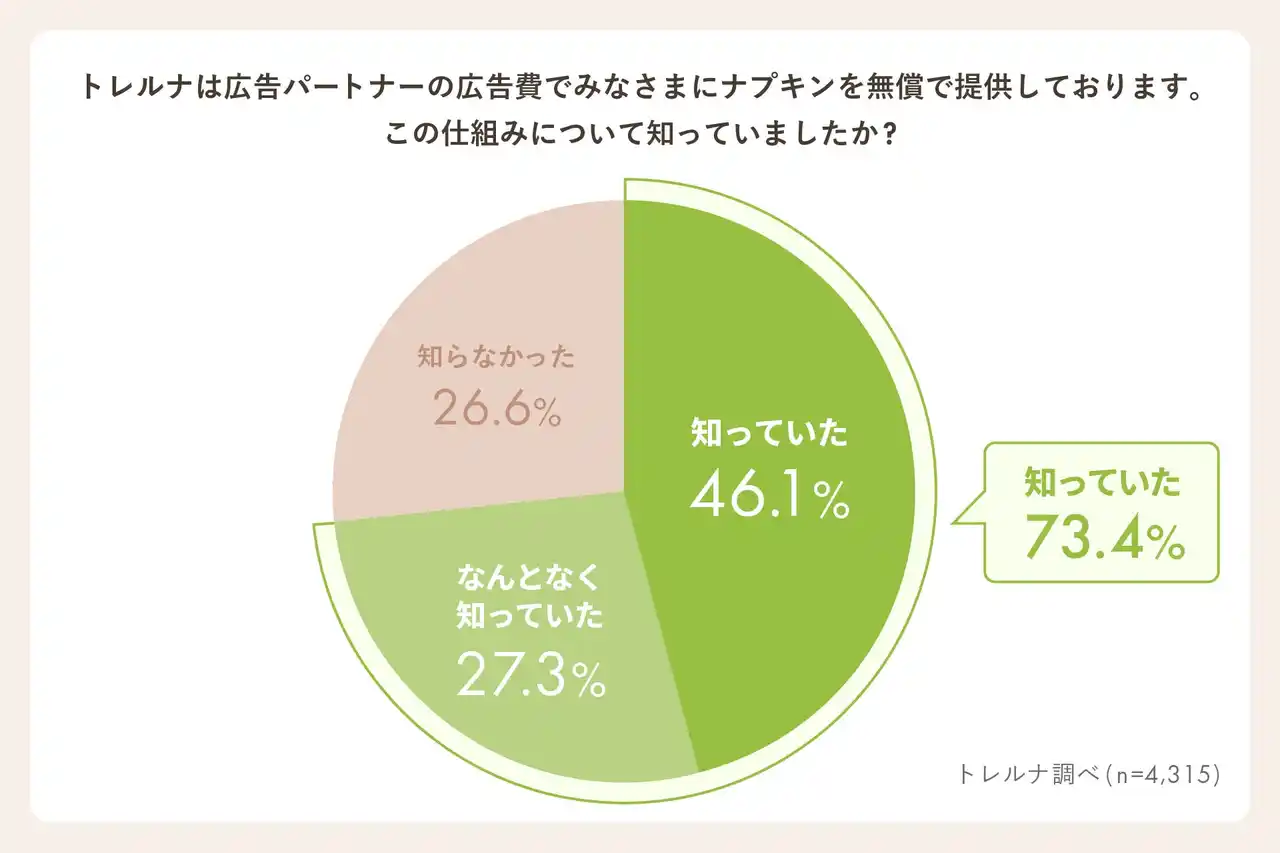 最後に、トレルナが、広告パートナーの出稿によって生理用ナプキンの無償提供を実現している仕組みについて伺うと、「知っていた」46.1%、「なんとなく知っていた」27.3%と、73.4%が認知していることがわかりました。 |