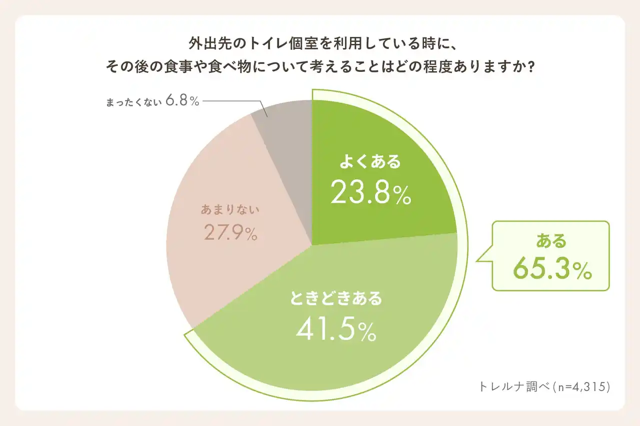 外出先トイレ個室で食事や食べ物について考えることが「よくある」「ときどきある」と回答した人は65.3%。食事内容や店選びなど、食に関する検討や選択を行う時間になっている |