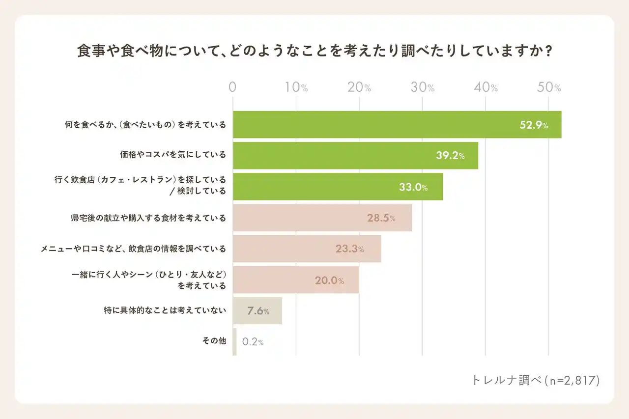 さらに具体的にどんなことを考えたり調べたりしているかを伺ったところ、「何を食べるか考えている」52.9%、「価格やコスパを気にしている」39.2%、「飲食店を探している」33.0%など、具体的な購買・来店に直結する思考が多く見られました。これらの結果から、トイレ個室は「食」に関する検討や選択を考える時間の一つとなっていることがわかりました。 |