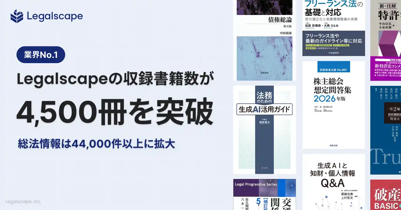 株式会社Legalscape(本社:東京都文京区、代表取締役社長・最高経営責任者:八木田 樹、以下リーガルスケープ)は、は、リーガルリサーチプラットフォーム「Legalscape(リーガルスケープ)」の収録書籍数が4,500冊を突破したことをお知らせします。 |