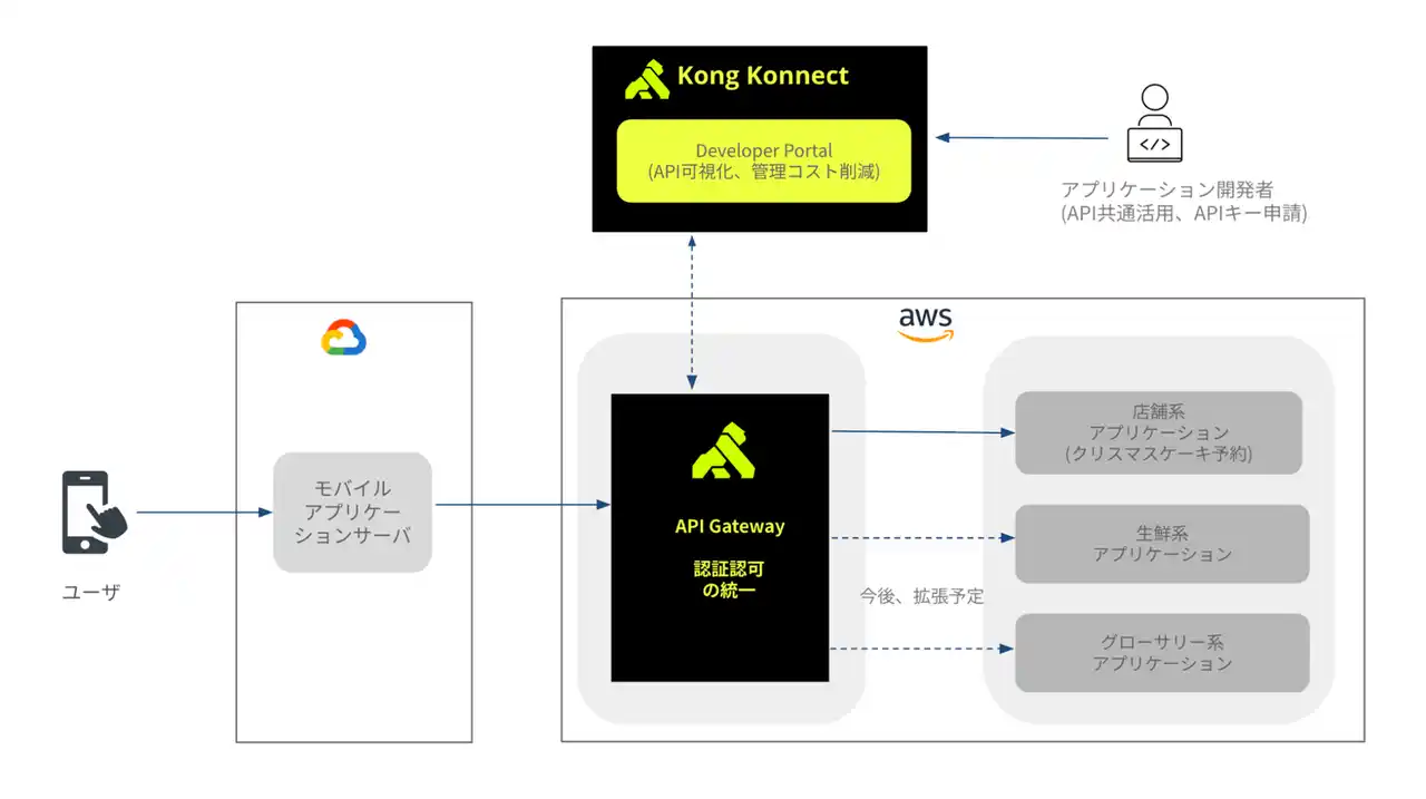 第一弾のプロジェクトとして、2025年冬の「クリスマスケーキ予約システム」にて運用を開始しました。異なるクラウド環境を跨ぐ通信を「Kong」で制御することで、繁忙期における安定稼働とセキュアな接続を実現しています。今後は、店舗系、生鮮系、グロサリー系などの主要業務システムへ順次適用範囲を拡大し、全社横断的なAPI管理プラットフォームの構築を目指します。 |