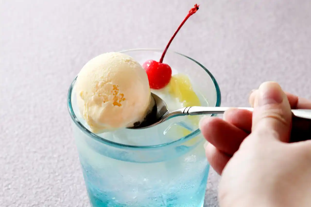 写真左:ラムネ風クリームソーダ、写真右:メロンクリームソーダ |