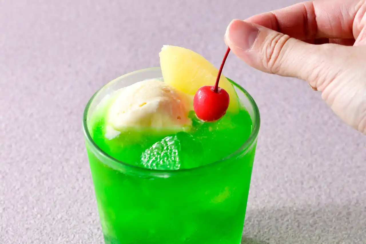 どこか懐かしさを感じる、王道のメロンフレーバーです。さわやかなグリーンの色合いと、アイスクリーム・チェリー・パインのトッピングが、レトロな雰囲気を醸し出します。 |