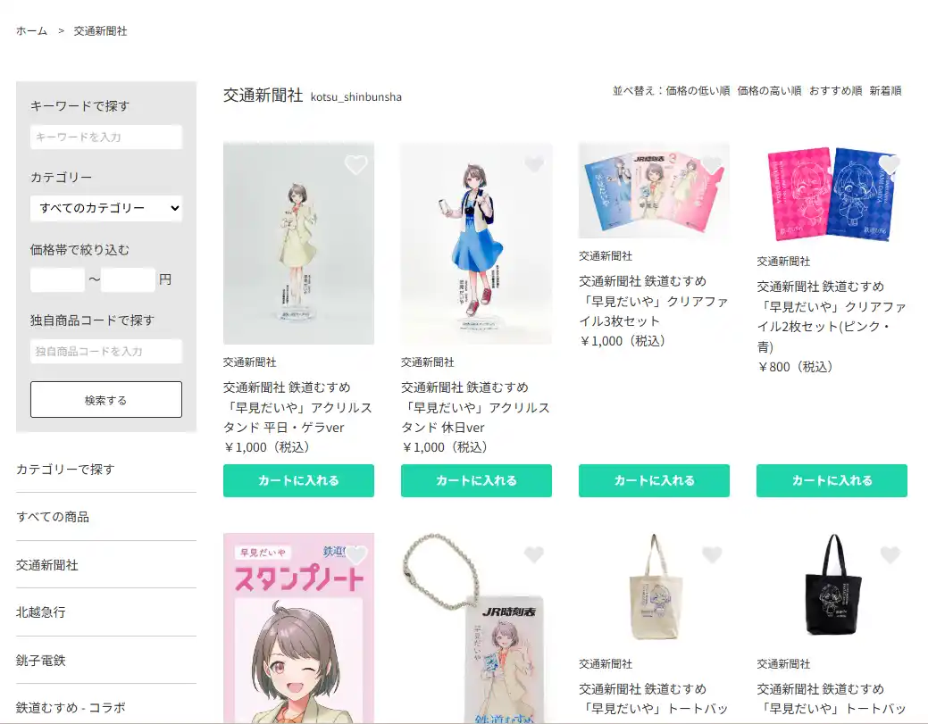 第一弾は、「鉄道むすめ」グッズを中心としたスタートとなりますが、今後は全国の鉄道会社様と連携を深め、順次取り扱いカテゴリーやラインナップを拡充していく予定です。 |