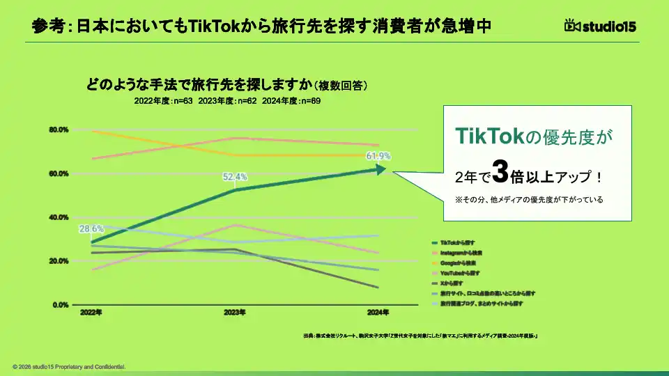 また、リクルート社と駒沢女子大学が行った調査では、「旅行先を探すツール」としてTikTokの優先度が2年間で3倍以上上昇しています。 |