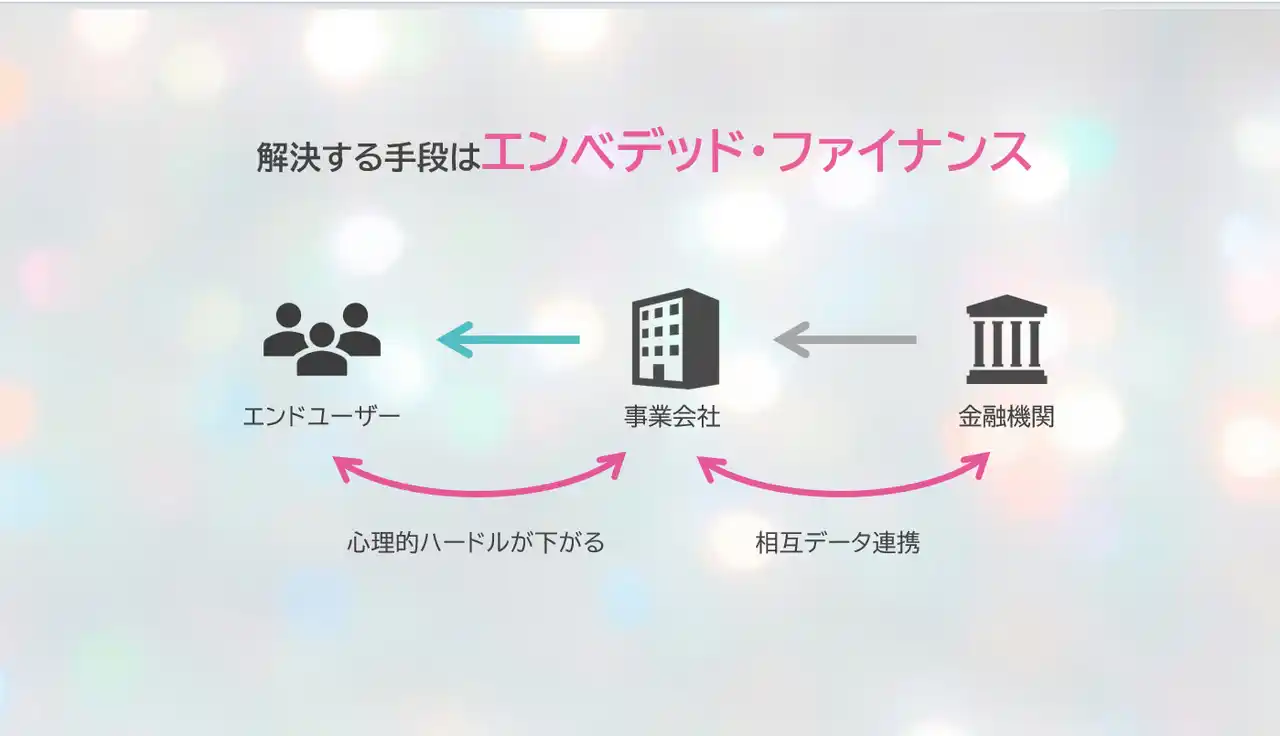エンドユーザーは普段使っているアプリの中で、自然にお金を借りることができるため心理的ハードルを下げられる上に、データ連携により自分に合った与信を受けられることになります。 |