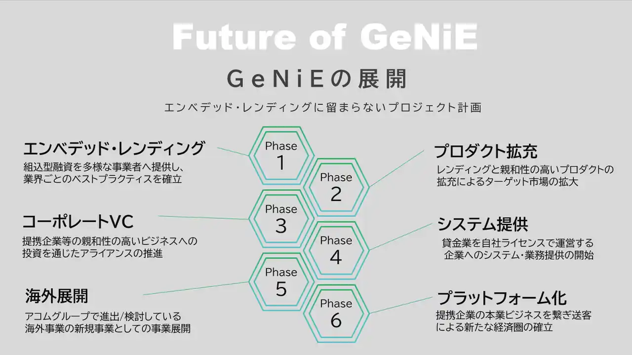 GeNiEは、レンディング(貸付)領域におけるエンベデッド・ファイナンスを推進するべく設立された、消費者金融のリーディングカンパニーであるアコム株式会社の子会社です。エンベデッド・ファイナンスとは「事業会社が、自社のサービスに金融サービスを組み込んで提供する」ことを指します。GeNiEは、2024年6月より、Webやアプリを通じてサービスを提供する事業会社が既存事業にレンディング機能をプラスするための組込型金融サービス「マネーのランプ」を提供しています。 |