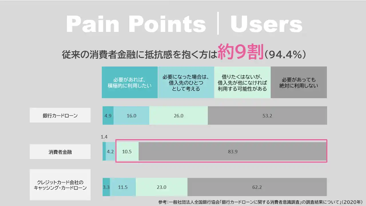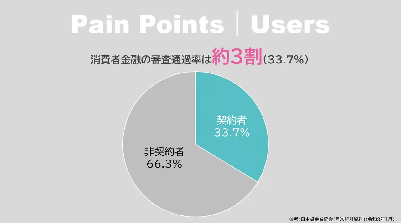 従来の消費者金融の利用に抵抗を感じる人は約9割と心理的なハードルが高く、高いハードルを乗り越えて申込んでも消費者金融の審査通過率はわずか3割と、残り7割の資金ニーズに応えられていない現状があります。これは、金融機関の多くが属性などの表面的なデータのみで与信判断を行わざるを得ないことに起因しています。 |