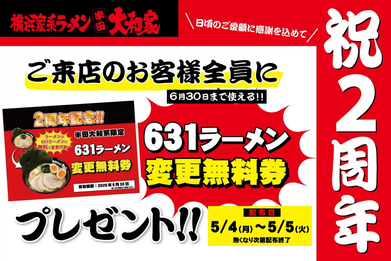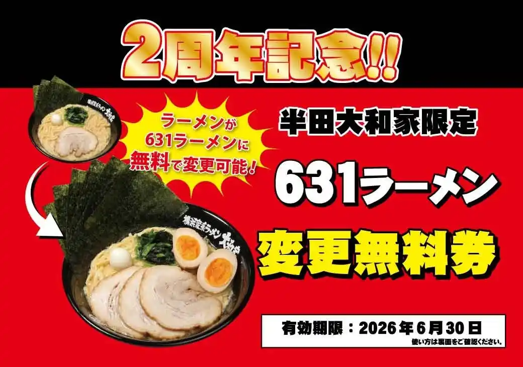 株式会社AZism(本社:東京都立川市、代表取締役会長:和田 敏典)が運営する「横浜家系ラーメン半田大和家」は2周年を記念し、皆様へ感謝の気持ちを込めて、期間中ご来店いただいたすべてのお客様へ「631ラーメン変更無料券」をプレゼントいたします。 |