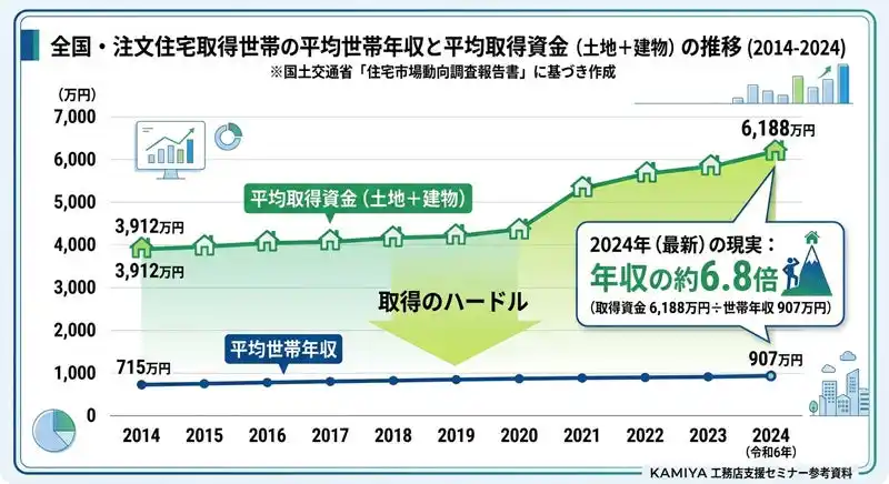 昨今、世界的な情勢不安を背景に、エネルギーや物流、資材価格の動向は依然として不透明な状況が続いています。加えて国内では、住宅価格の上昇、生活者の実質負担の増加、建設現場の担い手不足が重なり、住宅業界を取り巻く環境はこの5年で急激に厳しさを増しています。国土交通省の調査(※1)によると、土地付き注文住宅の取得資金は平均で6,188万円にのぼり、購入者の世帯年収は907万円にまで上昇しています。これは、平均世帯年収の1.7倍となり、注文住宅を取得できるのは高所得層に限られているのが現状です。このため工務店にはより高付加価値な提案力が求められており、価格を下げるのではなく、設計力や提案力、暮らし方への寄り添いなど、自社の価値を明確に伝えていくことが一層重要になっています。 |