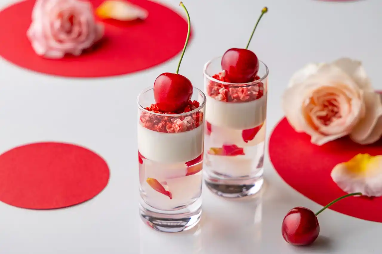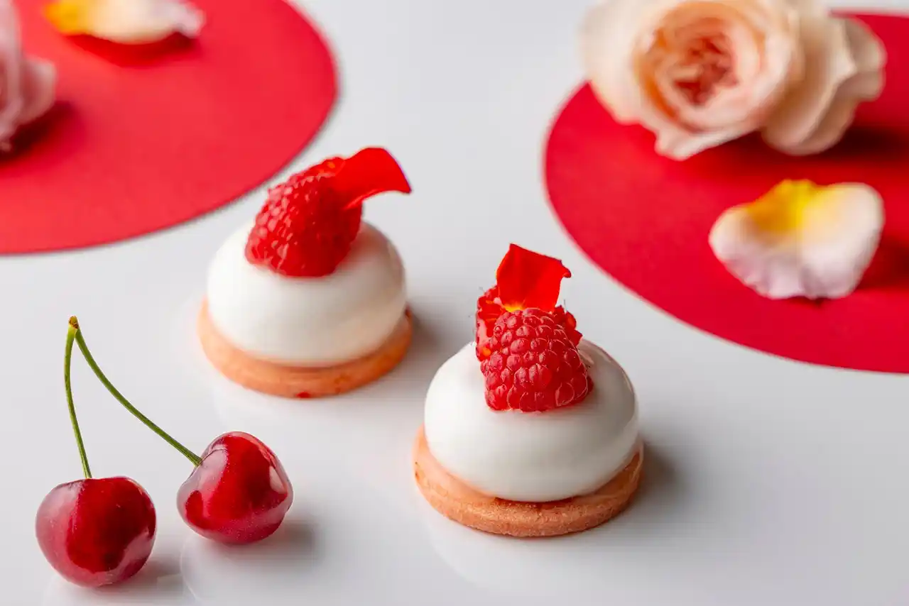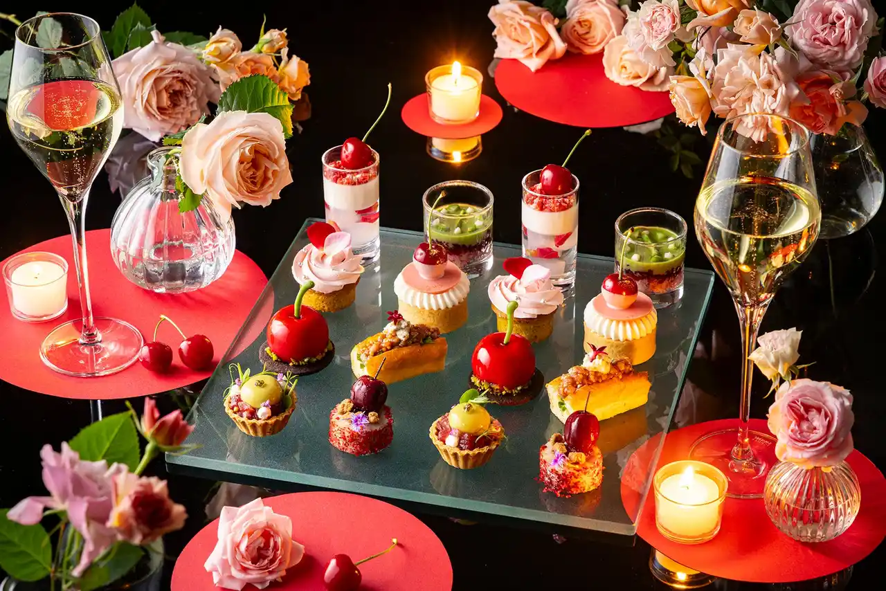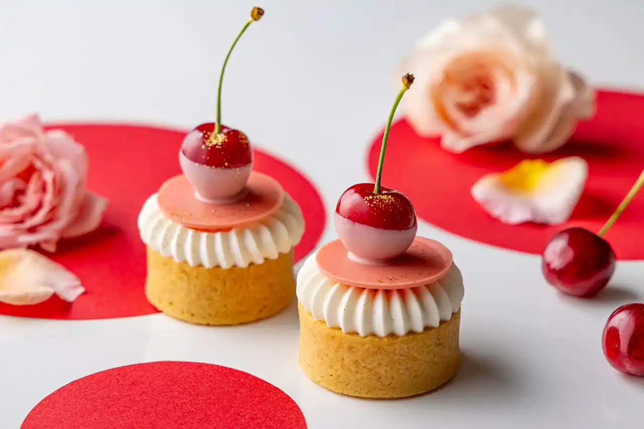 見た目の愛らしさと、はじけるような甘みで唯一無二の魅力を放つチェリーは、古くから幸福の果実として神話にも描かれ、人々に親しまれてきました。その一方で、初夏のわずかな時期にだけ出会える、季節の訪れを告げる特別な果実でもあります。一年を通してさまざまな食材を楽しめる現代だからこそ、コンラッド東京では、この時季ならではのおいしさと風情を大切にしたいという想いから、可憐なチェリーを主役に、華やかでかぐわしい初夏のバラ園から着想を得た「チェリー&ローズ アフタヌーンティー