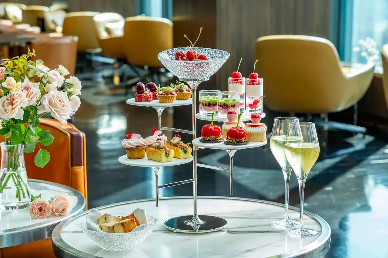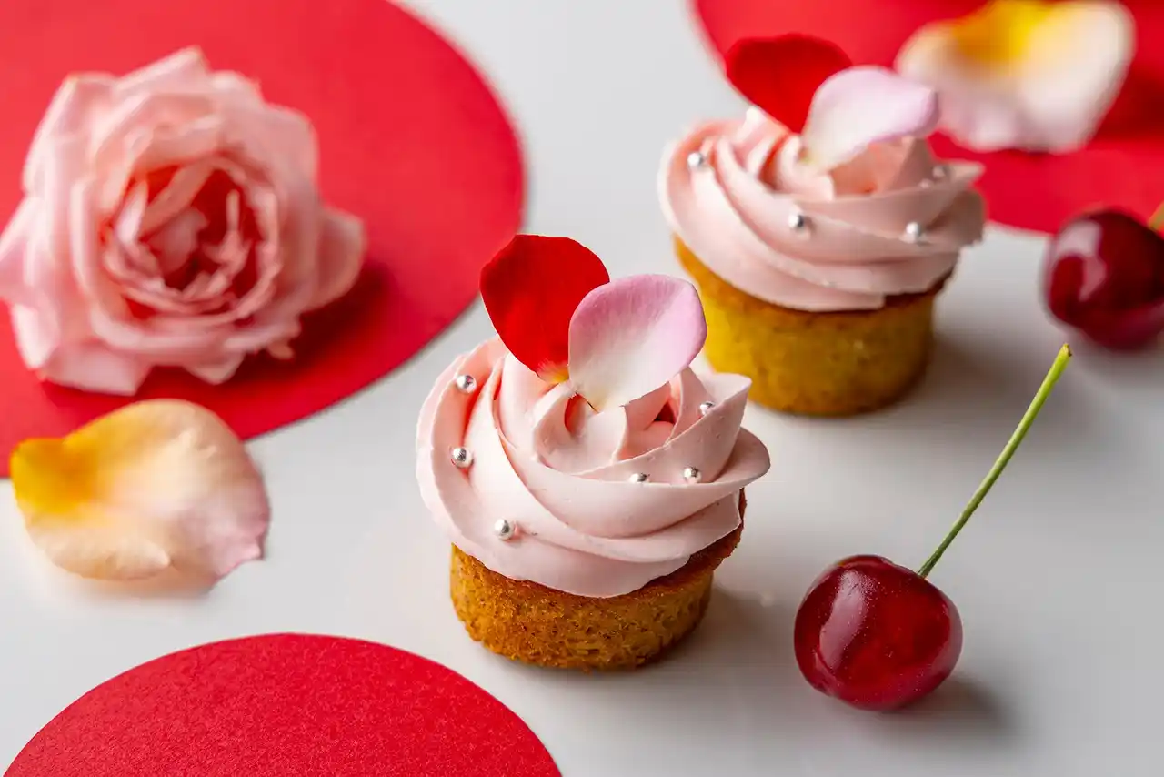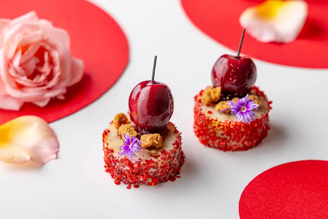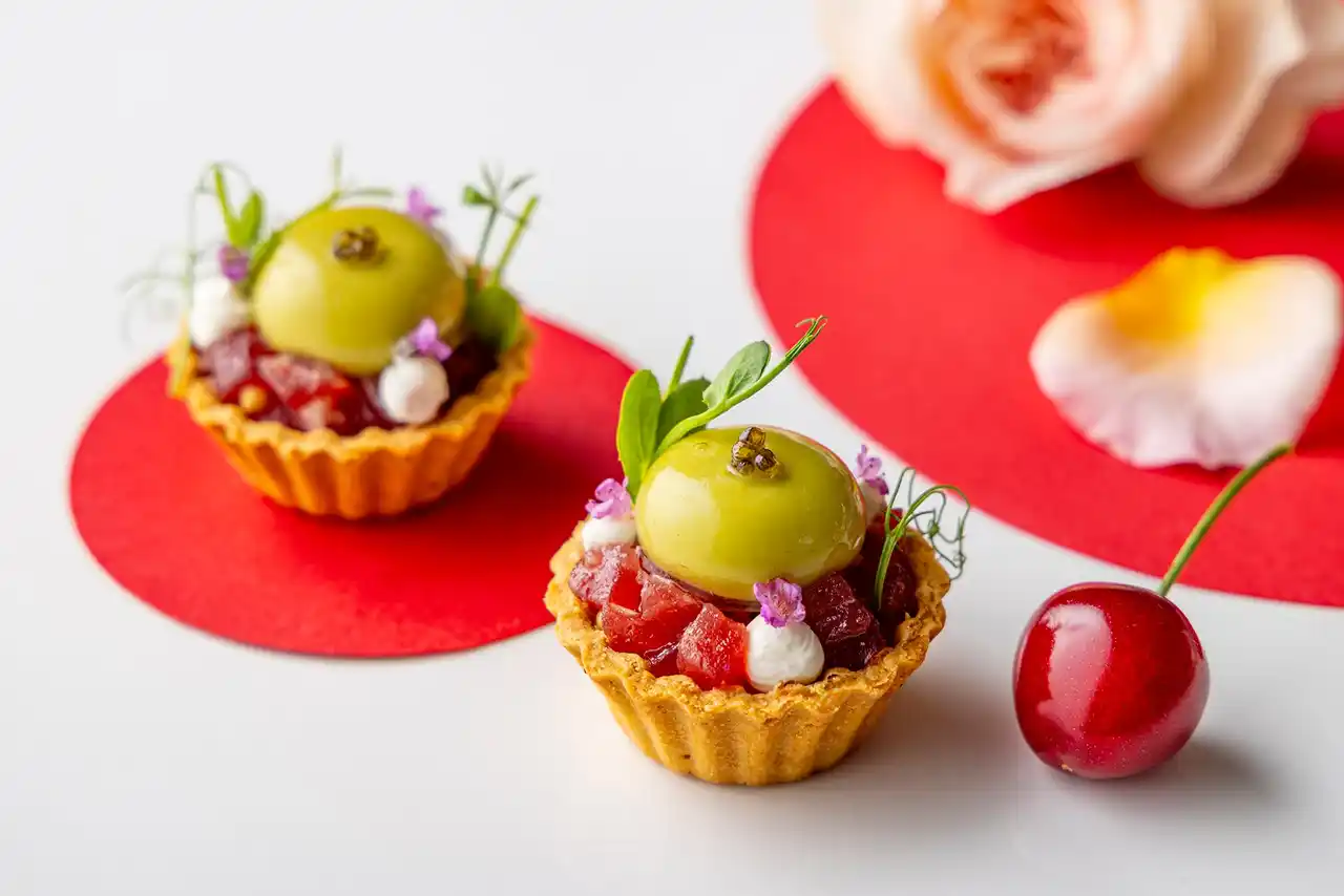 見た目の愛らしさと、はじけるような甘みで唯一無二の魅力を放つチェリーは、古くから幸福の果実として神話にも描かれ、人々に親しまれてきました。その一方で、初夏のわずかな時期にだけ出会える、季節の訪れを告げる特別な果実でもあります。一年を通してさまざまな食材を楽しめる現代だからこそ、コンラッド東京では、この時季ならではのおいしさと風情を大切にしたいという想いから、可憐なチェリーを主役に、華やかでかぐわしい初夏のバラ園から着想を得た「チェリー&ローズ アフタヌーンティー