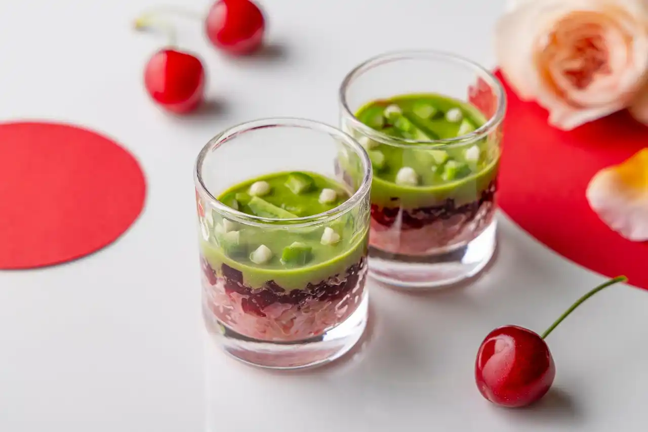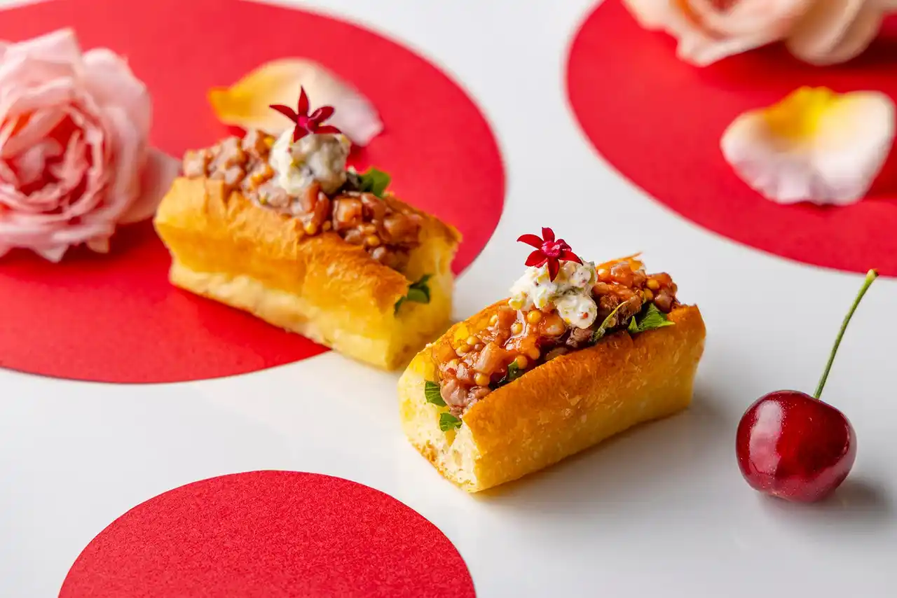 マグロのタルタルに、アボカドのムースと酸味まろやかなフレッシュチーズを組み合わせました。マスタードとサワークリームをアクセントに、一口に異なる風味と食感が凝縮された華やかな味わいです。 |