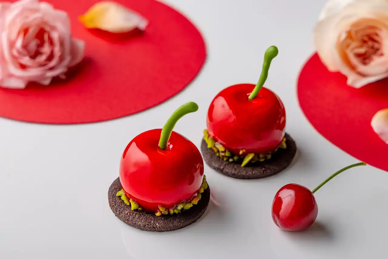 2種類のチェリーを使用し豊潤な甘みが広がるムースに、ミルクチョコレートとパッションフルーツのクリームを入れ、後味を軽やかに仕上げました。ピスタチオをアクセントにまぶし、ビターなココアクッキーが全体の味わいを引き締めます。 |